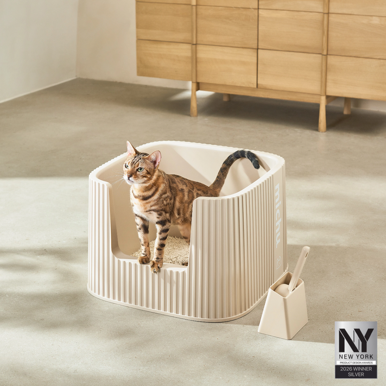The Michu Large Litter Box includes a matching large scoop and an optional highly absorbent cat litter mat to reduce kitty trails.